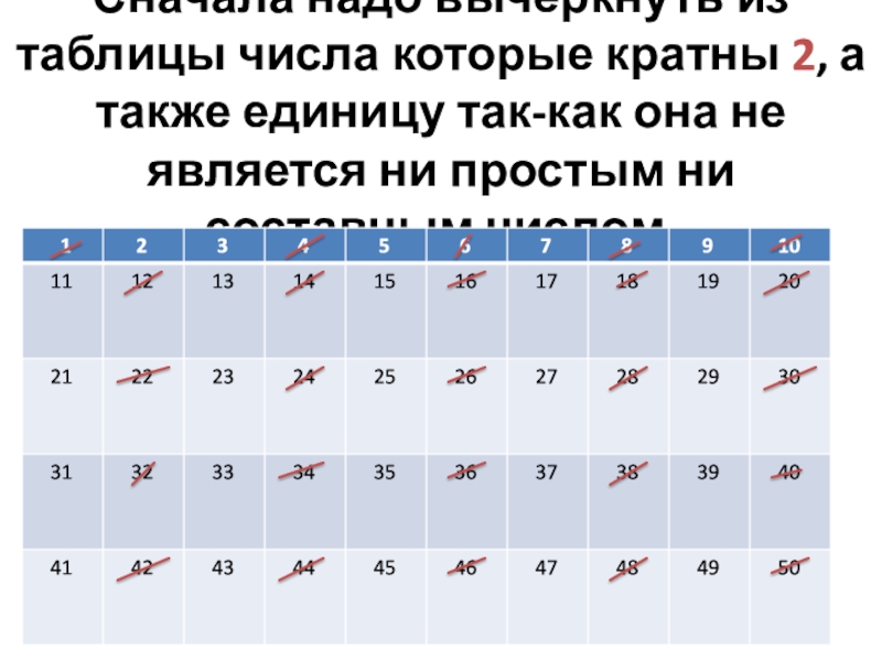 Слайд 2Сначала надо вычеркнуть из таблицы числа которые кратны 2, а также