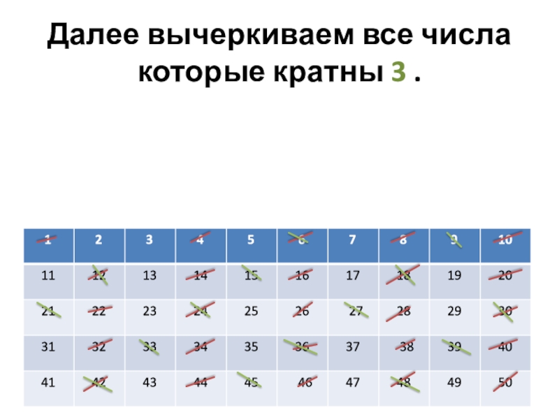 Слайд 3Далее вычеркиваем все числа которые кратны 3 .