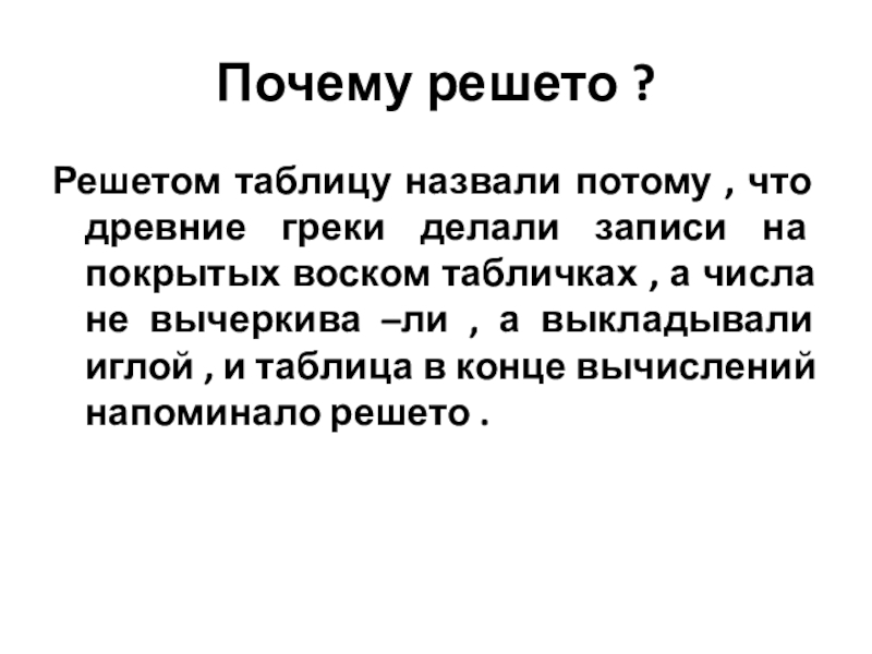 Почему решето ?Решетом таблицу назвали потому , что древние греки делали записи на покрытых воском табличках ,