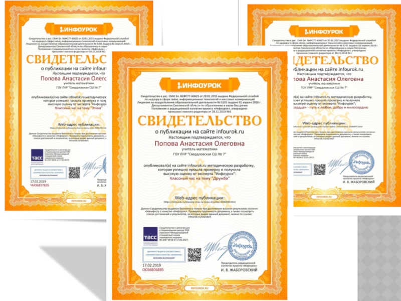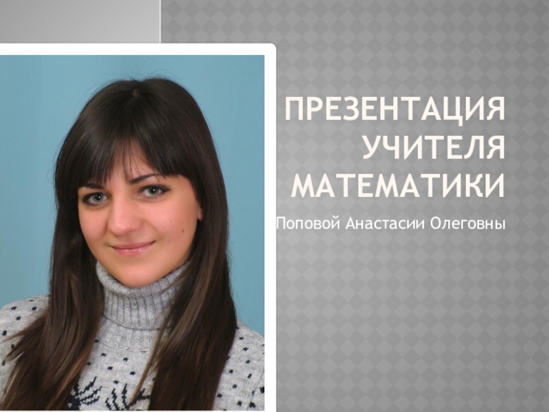 Слайд 2 Попова Анастасия Олеговна Дата рождения : 10.07.1993 Образование: высшее Специальность: «Учитель математики» Магистратура «Управление