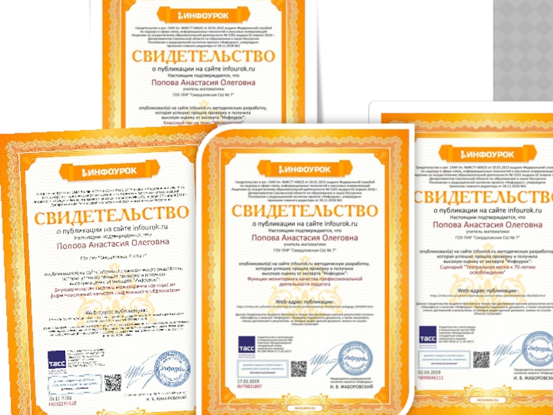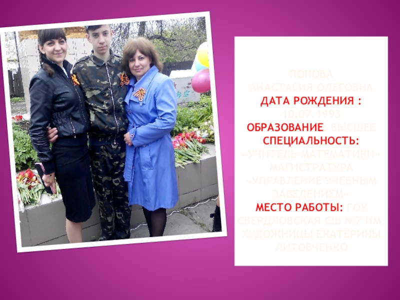 Попова Анастасия Олеговна Дата рождения : 10.07.1993 Образование: высшее Специальность: «Учитель математики» Магистратура «Управление учебным заведением» Место работы: ГОУ Свердловская СШ №7 им. художницы Екатерины Литовченко