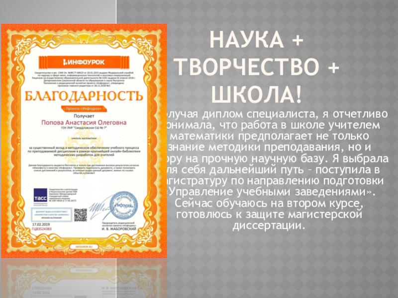 Наука + творчество + школа!   Получая диплом специалиста, я отчетливо понимала, что работа в школе учителем