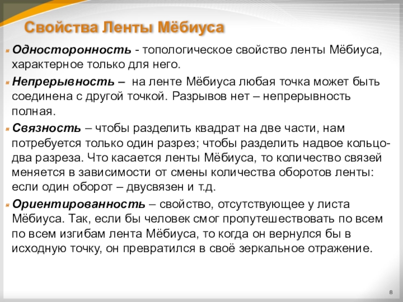Ориентированность – свойство, отсутствующее у листа Мёбиуса. Так, если бы человек смог пропутешествовать по всем по всем изгибам лента Мёбиуса, то когда он вернулся бы в исходную точку, он превратился в своё зеркальное отражение.