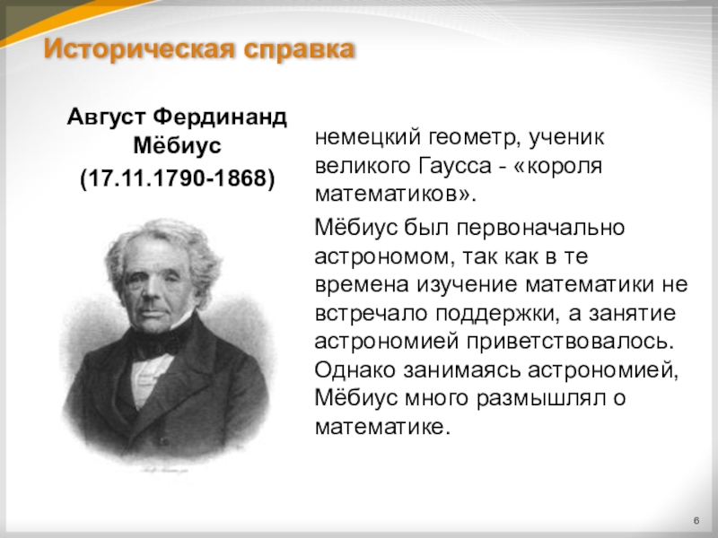 Мёбиус был первоначально астрономом, так как в те времена изучение математики не встречало поддержки, а занятие астрономией приветствовалось. Однако занимаясь астрономией, Мёбиус много размышлял о математике.
