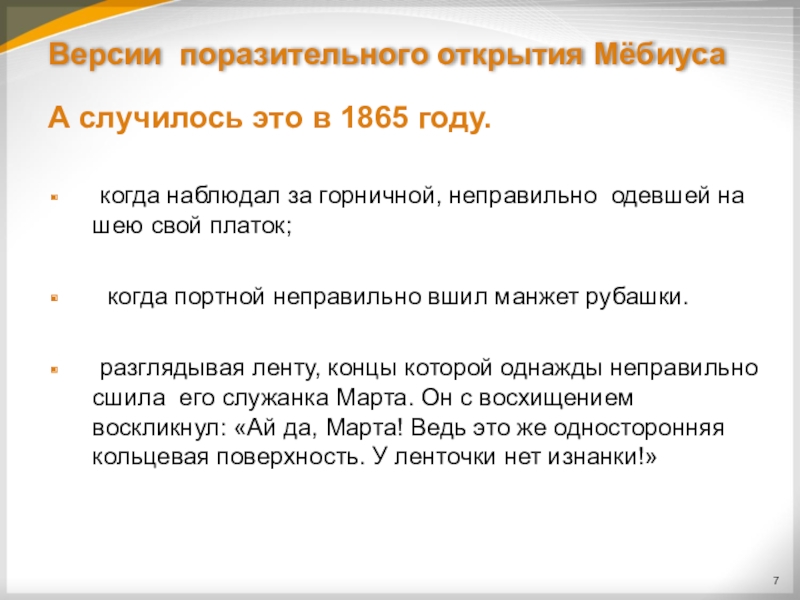 разглядывая ленту, концы которой однажды неправильно сшила его служанка Марта. Он с восхищением воскликнул: «Ай да, Марта! Ведь это же односторонняя кольцевая поверхность. У ленточки нет изнанки!»