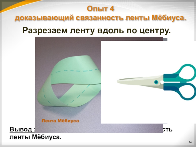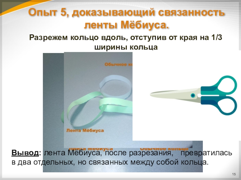 Слайд 15Опыт 5, доказывающий связанность ленты Мёбиуса.