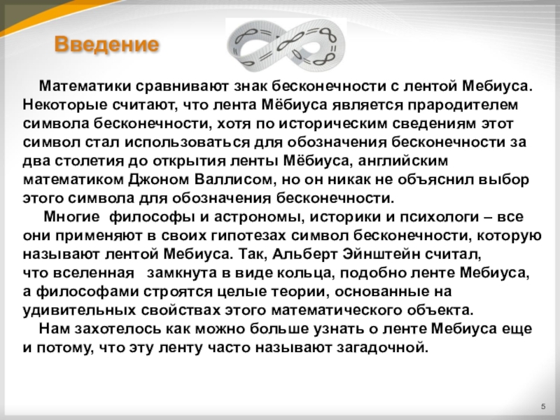 Многие философы и астрономы, историки и психологи – все они применяют в своих гипотезах символ бесконечности, которую называют лентой Мебиуса. Так, Альберт Эйнштейн считал, что вселенная замкнута в виде кольца, подобно ленте Мебиуса, а философами строятся целые теории, основанные на удивительных свойствах этого математического объекта.