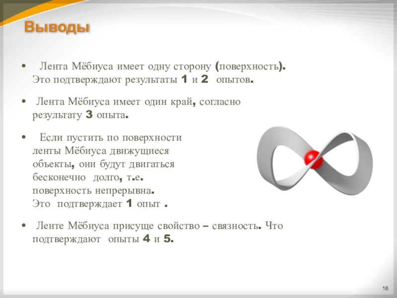 Лента Мёбиуса имеет одну сторону (поверхность). Это подтверждают результаты 1