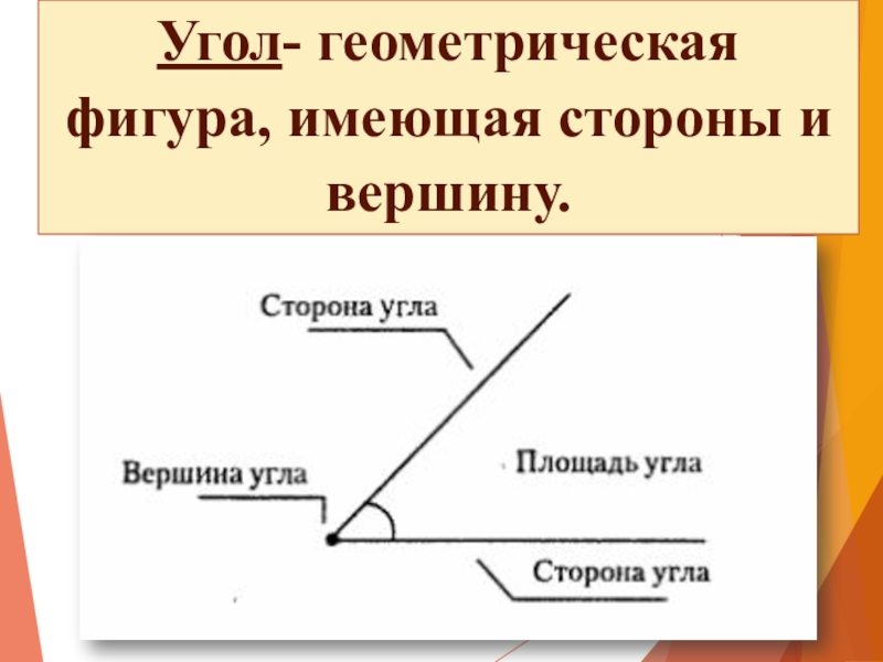 Слайд 8Угол- геометрическая фигура, имеющая стороны и вершину.