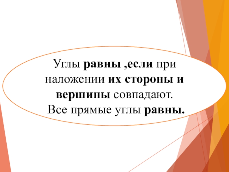 Слайд 13Углы равны ,если при наложении их стороны и вершины совпадают.