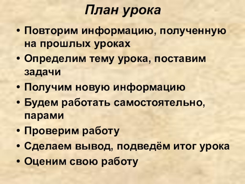 План урокаПовторим информацию, полученную на прошлых урокахОпределим тему урока, поставим задачиПолучим новую информациюБудем работать самостоятельно, парамиПроверим работуСделаем