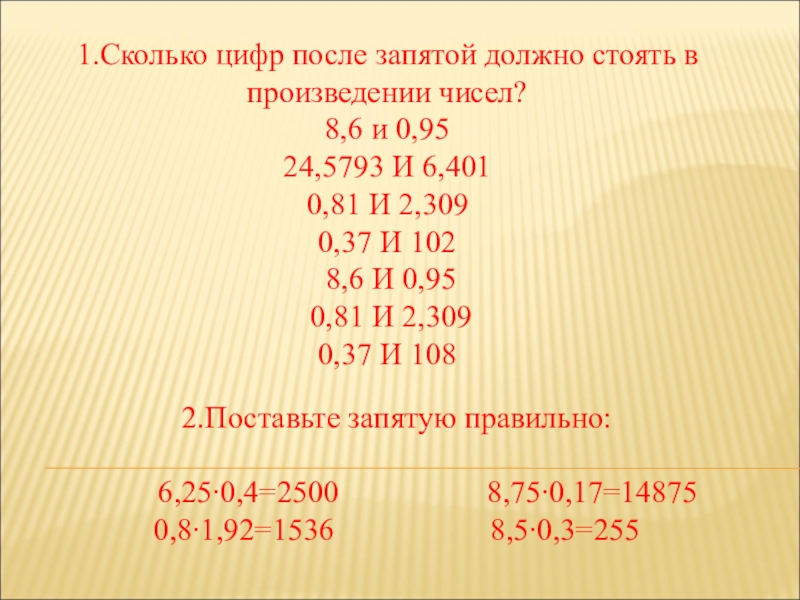 6,25∙0,4=2500 8,75∙0,17=14875 0,8∙1,92=1536 8,5∙0,3=255