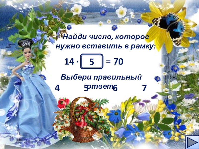 Найди число, которое нужно вставить в рамку:14 ·      = 705Выбери правильный ответ:4567