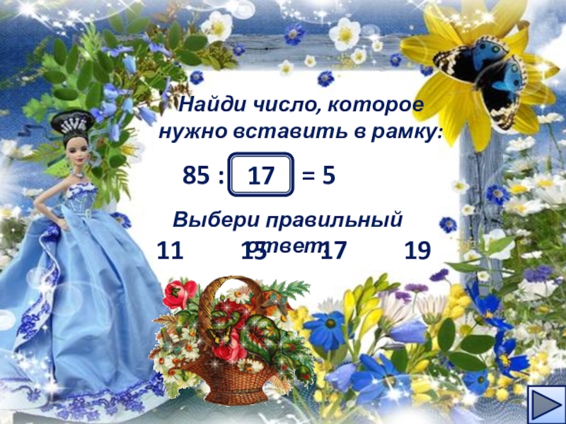 Найди число, которое нужно вставить в рамку:85 :      = 517Выбери правильный ответ:11171519