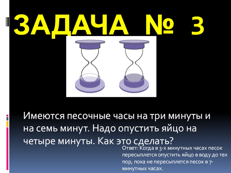 Ответ: Когда в 3-х минутных часах песок пересыплется опустить яйцо в воду до тех пор, пока не пересыплется песок в 7-минутных часах.