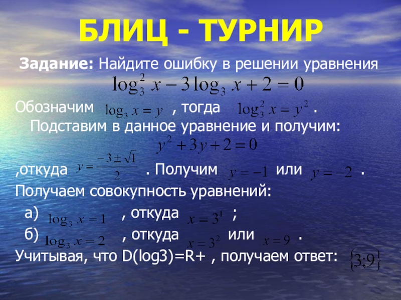 - На экране проецируется задание, требующее найти ошибку в решении уравнения.