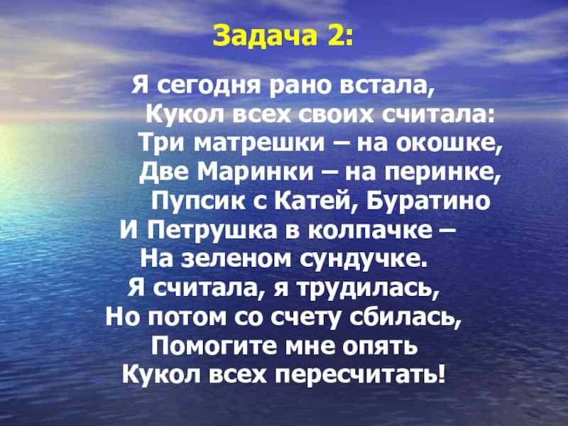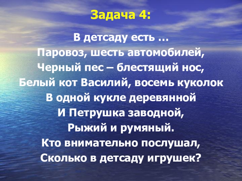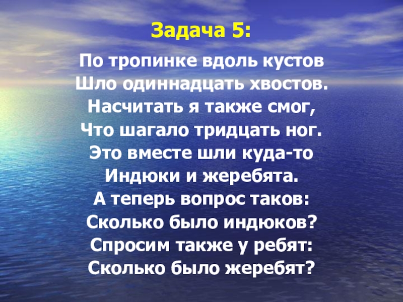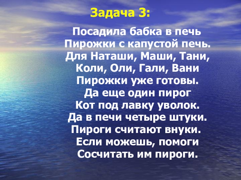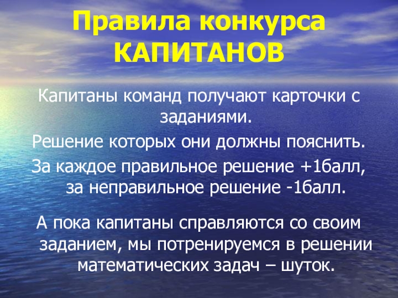 А пока капитаны справляются со своим заданием, мы потренируемся в решении математических задач – шуток.