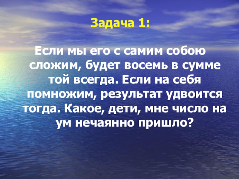 сумме той всегда. Если на себя помножим, результат удвоится тогда. Какое, дети, мне число на ум нечаянно пришло?