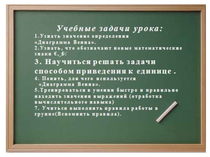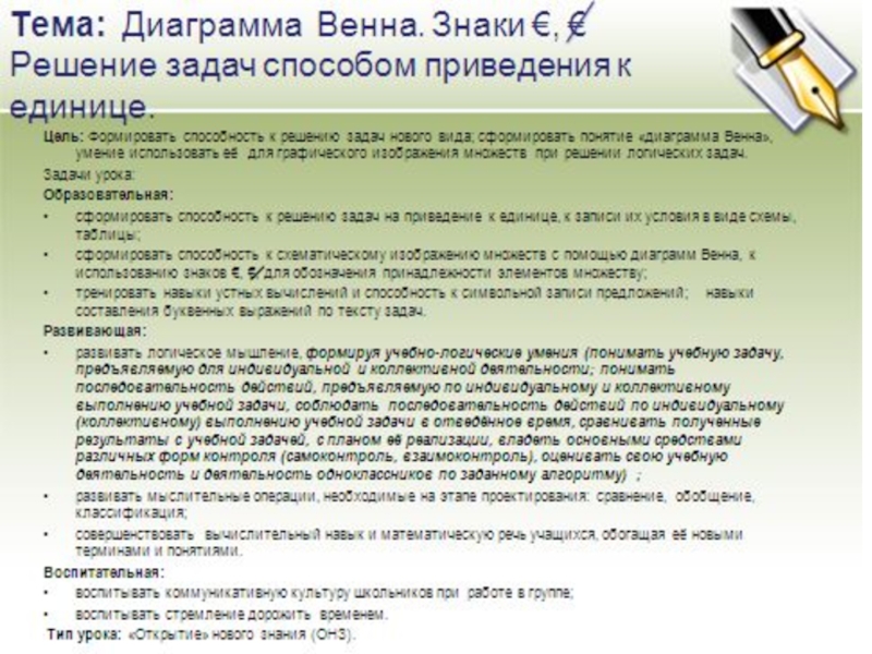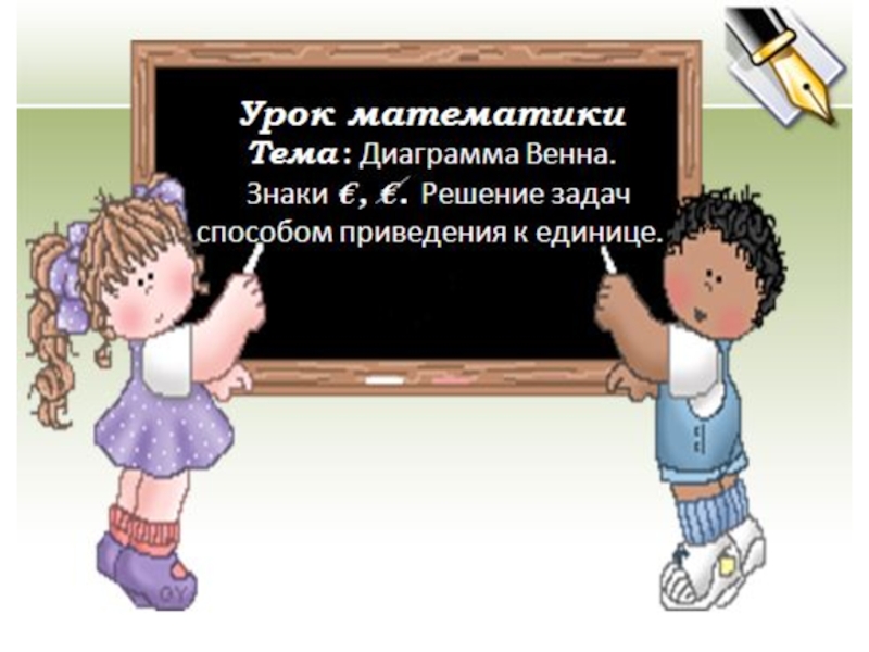 Презентация, доклад Урок математики Для 4 класса Тема. Диаграмма Эйлера Венна. Знаки€,/€. Решение задач способом приведения к единице. (Технология деятельностного метода с использованием стратегий критического мышления