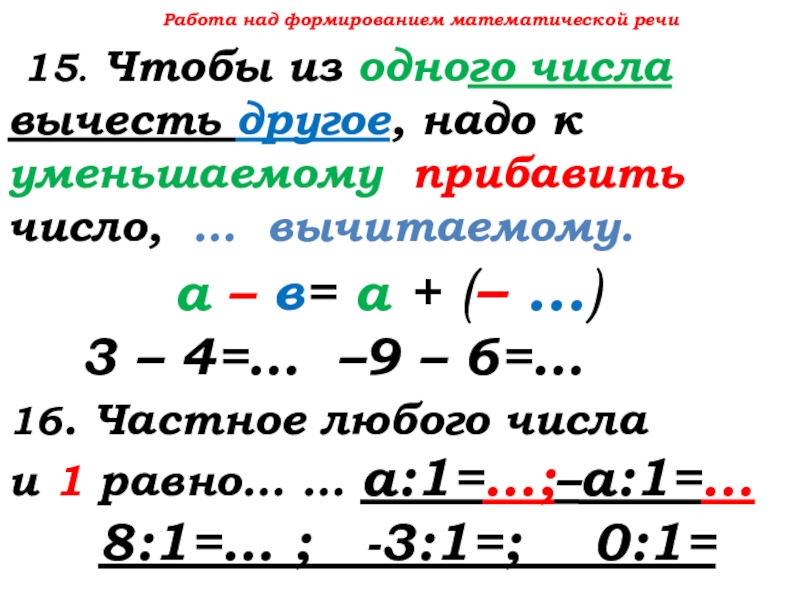 15. Чтобы из одного числа вычесть другое, надо к уменьшаемому прибавить число, … вычитаемому.