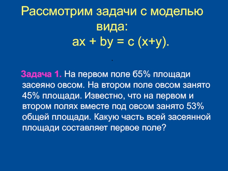 Задача 1. На первом поле б5% площади засеяно овсом. На втором поле овсом занято 45% площади. Известно, что на первом и втором полях вместе под овсом занято 53% общей площади. Какую часть всей засеянной площади составляет первое поле?