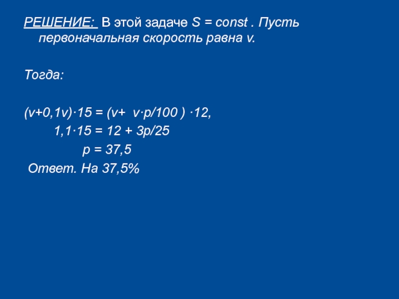 Слайд 17РЕШЕНИЕ: В этой задаче S = const . Пусть первоначальная скорость