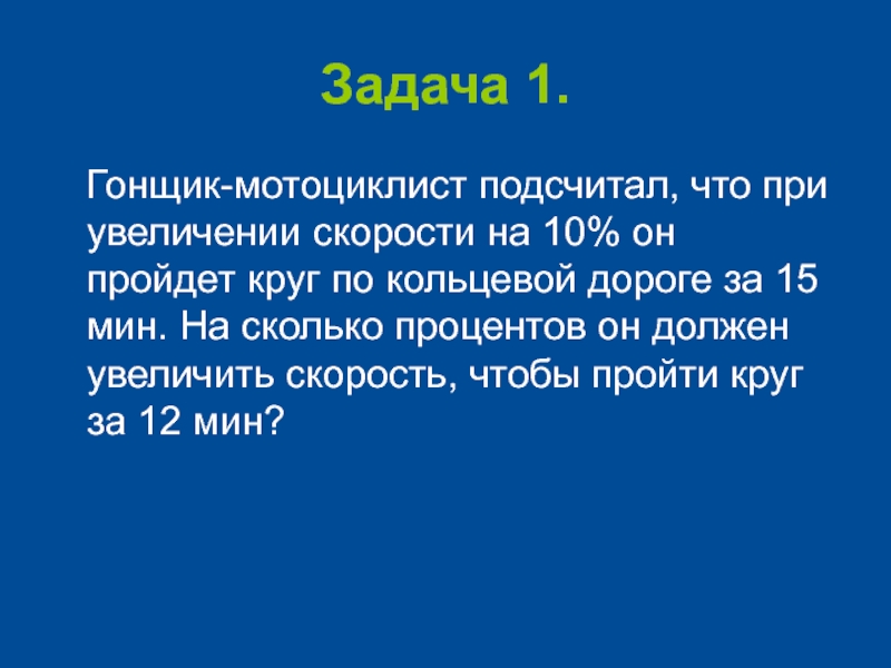 10% он пройдет круг по кольцевой дороге за 15 мин. На сколько процентов он должен увеличить скорость, чтобы пройти круг за 12 мин?