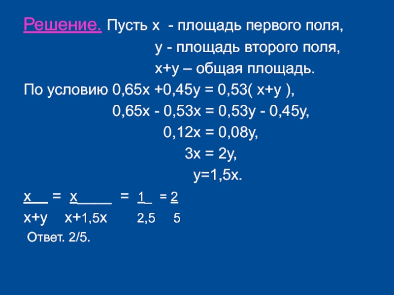 Слайд 23Решение. Пусть х - площадь первого поля,