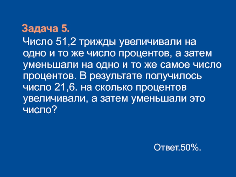 и то же число процентов, а затем уменьшали на одно и то же самое число процентов. В результате получилось число 21,6. на сколько процентов увеличивали, а затем уменьшали это число?