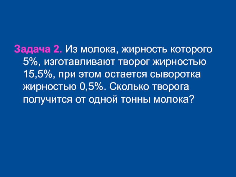 Задача 2. Из молока, жирность которого 5%, изготавливают творог жирностью 15,5%,