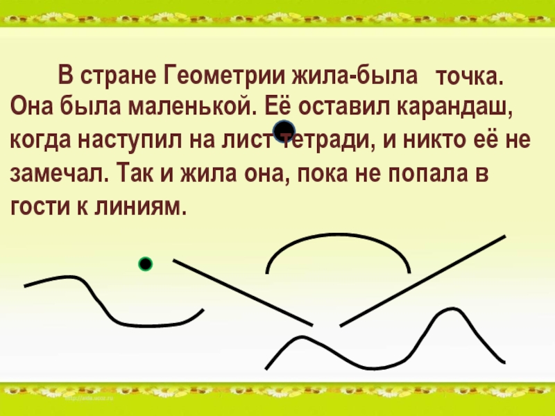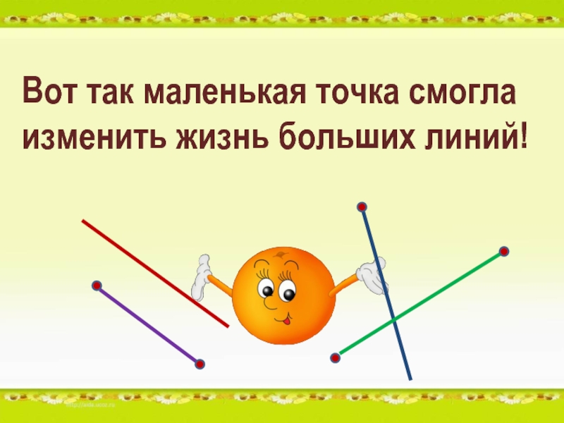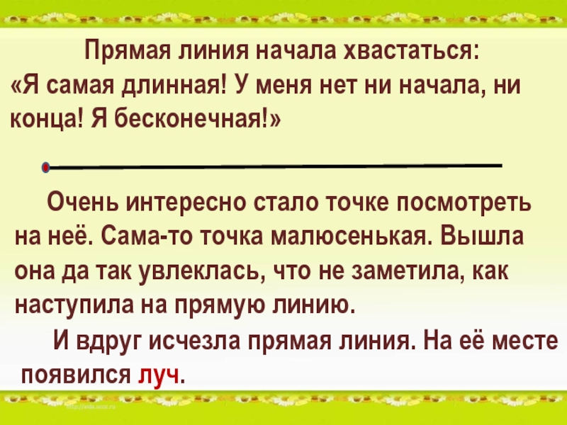 Очень интересно стало точке посмотреть на неё. Сама-то точка малюсенькая. Вышла она да так увлеклась, что не заметила, как наступила на прямую линию.
