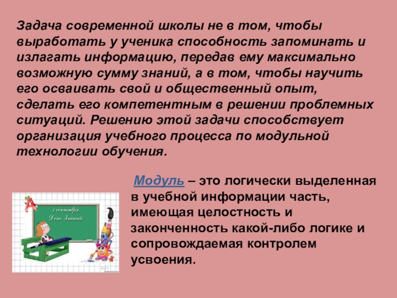 Модуль – это логически выделенная в учебной информации часть, имеющая целостность и законченность какой-либо логике и сопровождаемая контролем усвоения.