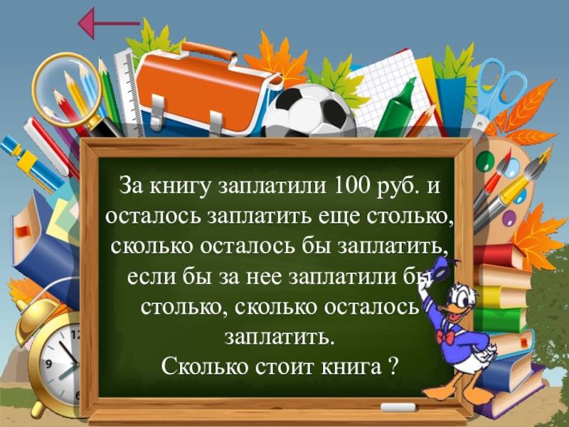 За книгу заплатили 100 руб. и осталось заплатить еще столько, сколько осталось бы заплатить, если бы за