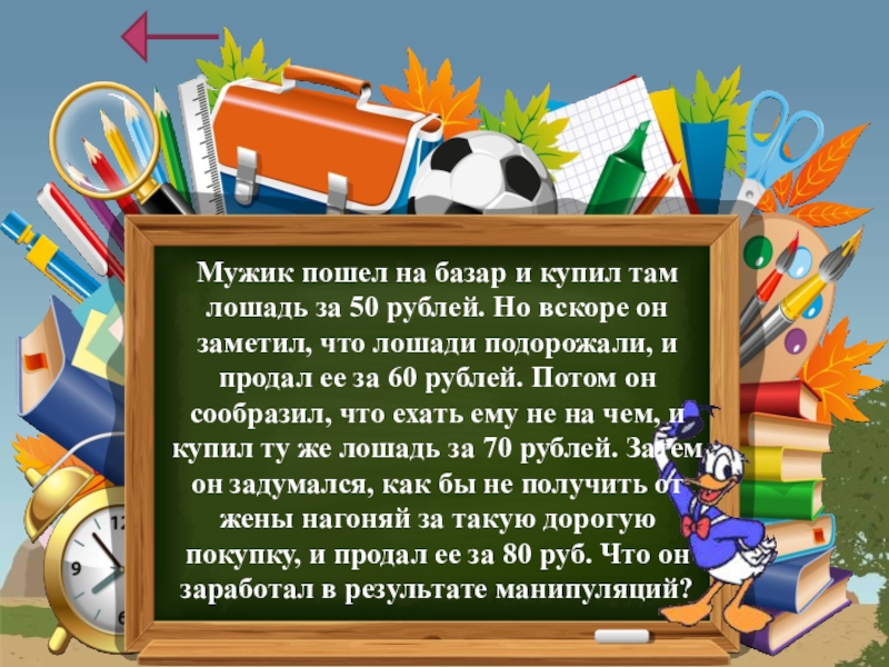 Но вскоре он заметил, что лошади подорожали, и продал ее за 60 рублей. Потом он сообразил, что ехать ему не на чем, и купил ту же лошадь за 70 рублей. Затем он задумался, как бы не получить от жены нагоняй за такую дорогую покупку, и продал ее за 80 руб. Что он заработал в результате манипуляций?