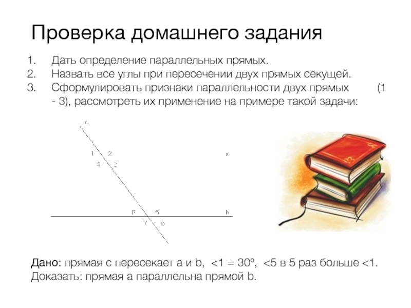 Дано: прямая с пересекает а и b, <1 = 30º, <5 в 5 раз больше <1. Доказать: прямая а параллельна прямой b.