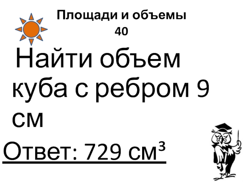 Площади и объемы 40 Найти объем куба с ребром 9 смОтвет: 729 см³
