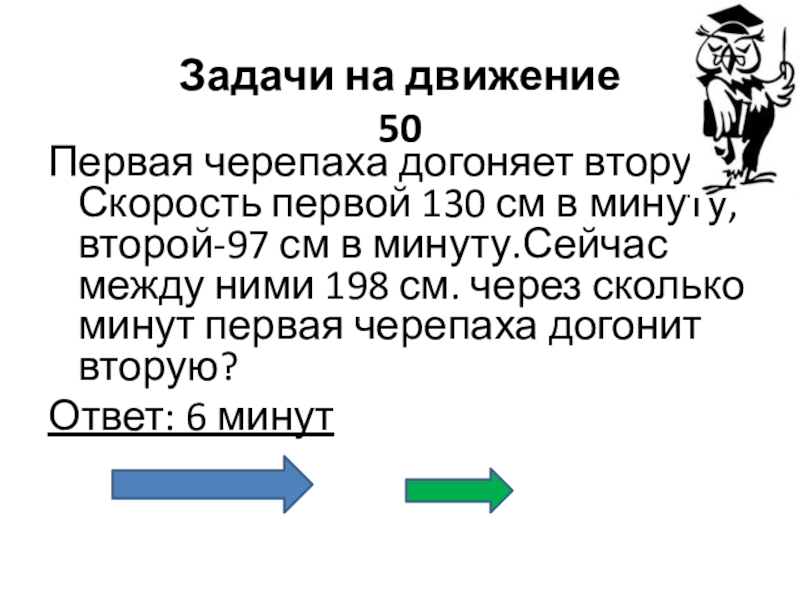 Задачи на движение 50Первая черепаха догоняет вторую. Скорость первой 130 см в минуту, второй-97 см в