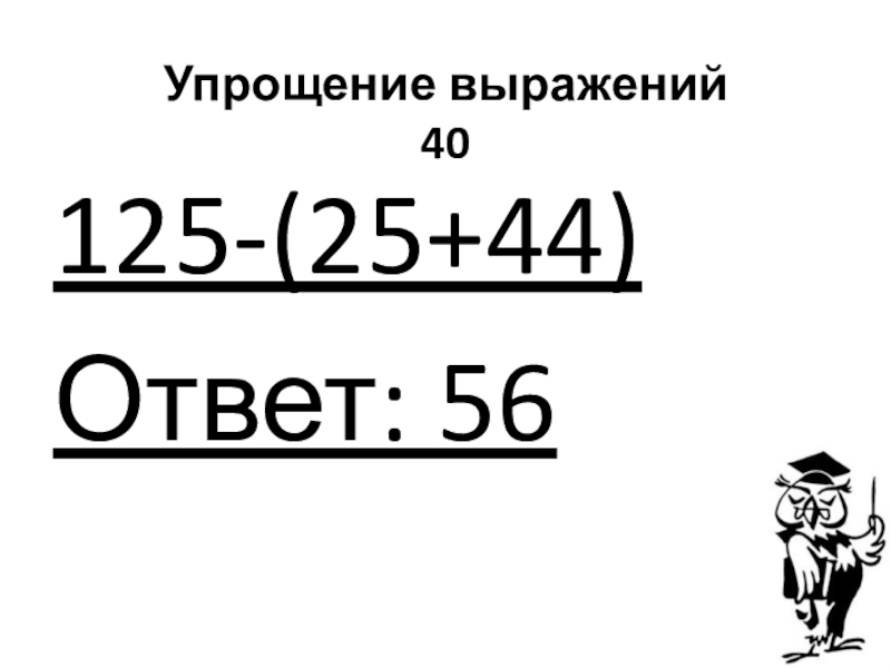 Упрощение выражений 40125-(25+44)Ответ: 56