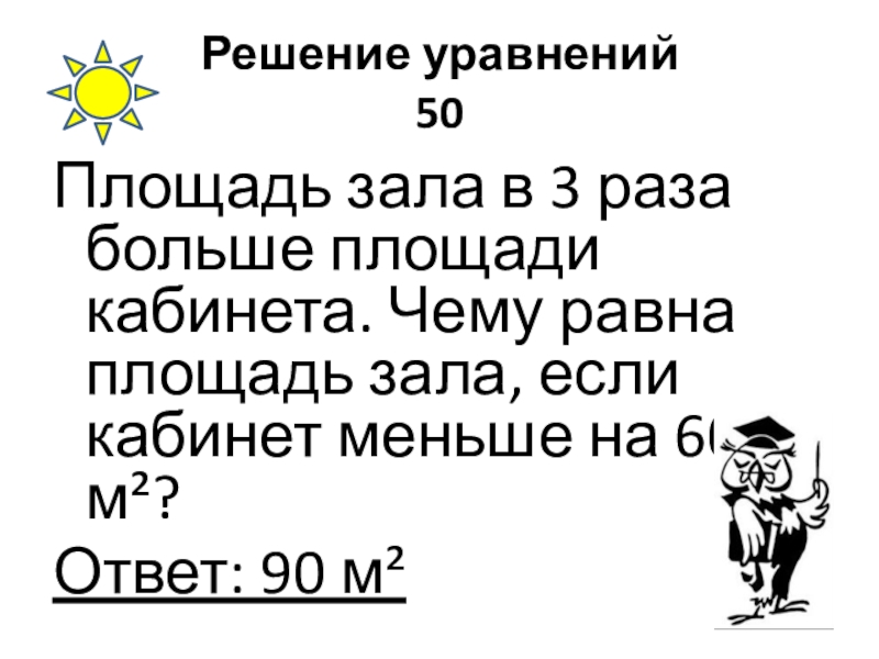 Решение уравнений 50Площадь зала в 3 раза больше площади кабинета. Чему равна площадь зала, если кабинет меньше