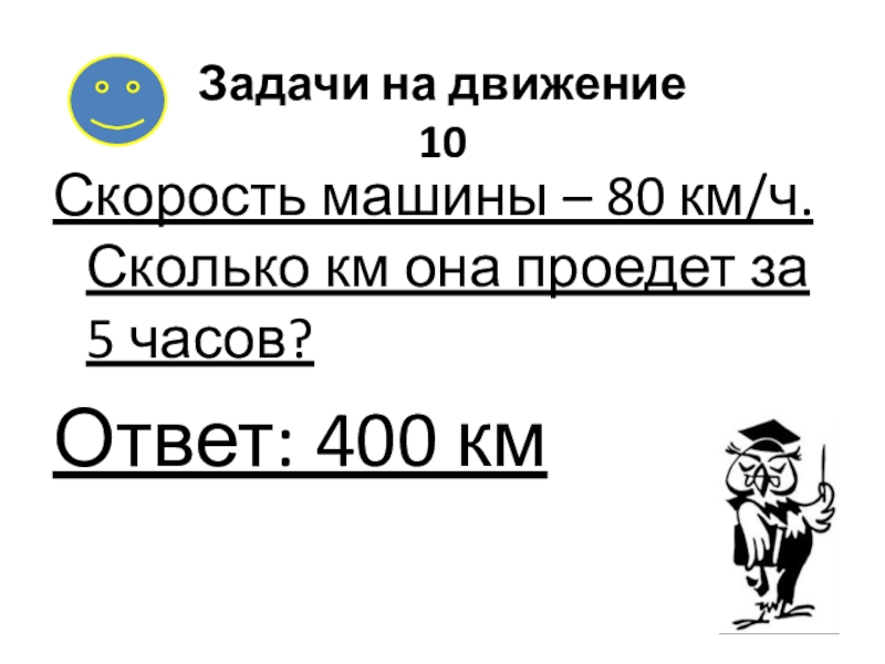 Задачи на движение 10Скорость машины – 80 км/ч. Сколько км она проедет за 5 часов?Ответ: 400