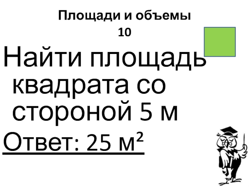 Площади и объемы 10Найти площадь квадрата со стороной 5 мОтвет: 25 м²