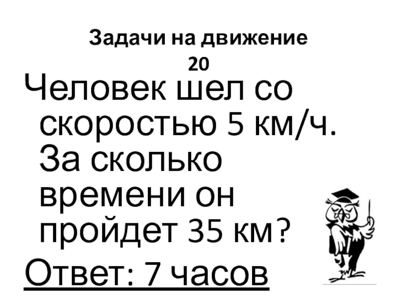 Задачи на движение 20Человек шел со скоростью 5 км/ч. За сколько времени он пройдет 35 км?Ответ: