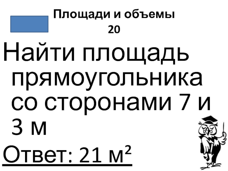 Площади и объемы 20Найти площадь прямоугольника со сторонами 7 и 3 мОтвет: 21 м²