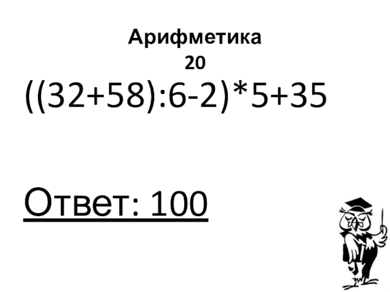 Арифметика 20((32+58):6-2)*5+35Ответ: 100