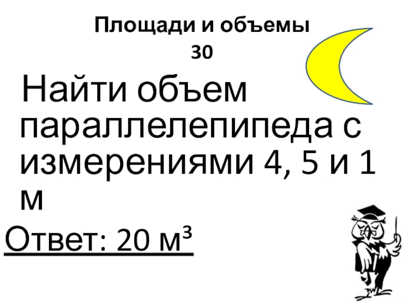 Площади и объемы 30 Найти объем параллелепипеда с измерениями 4, 5 и 1 мОтвет: 20 м³