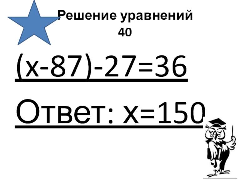 Решение уравнений 40(x-87)-27=36Ответ: х=150