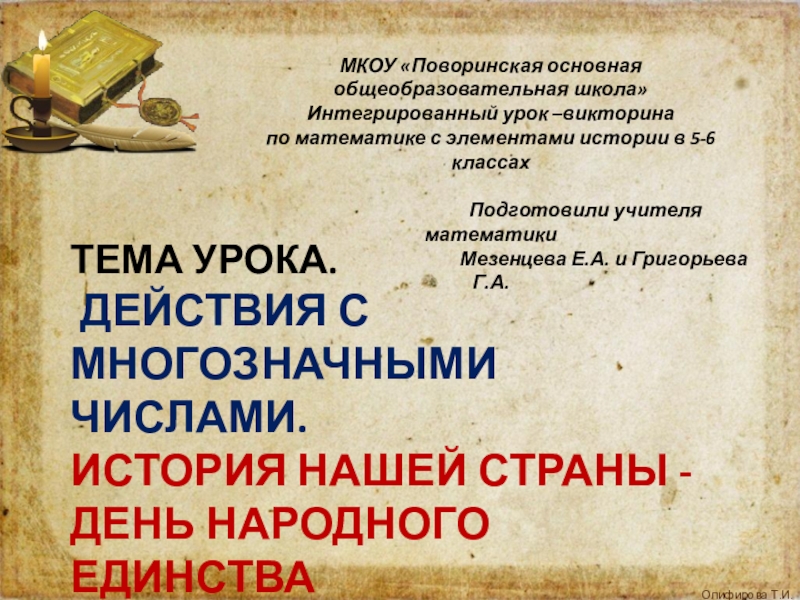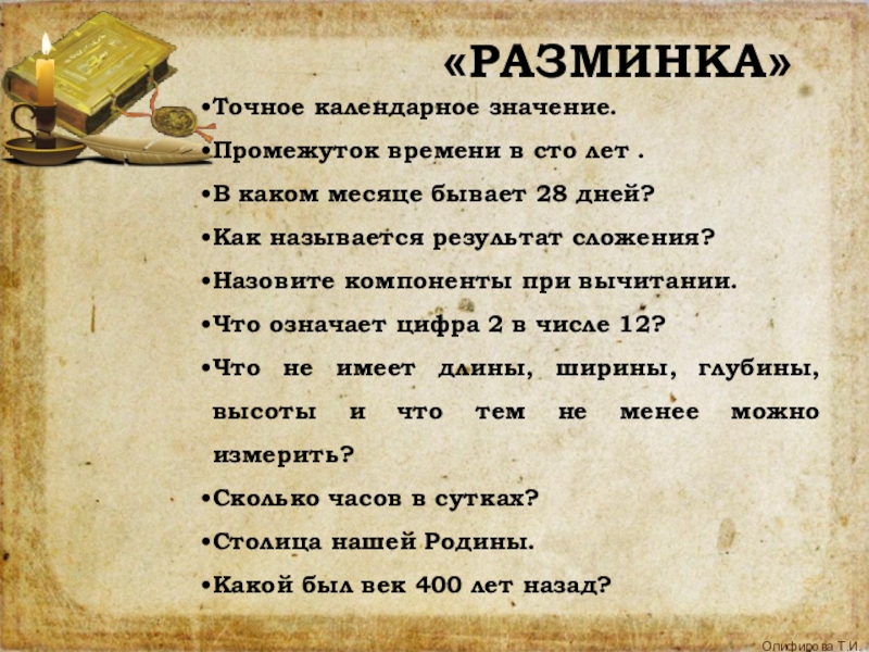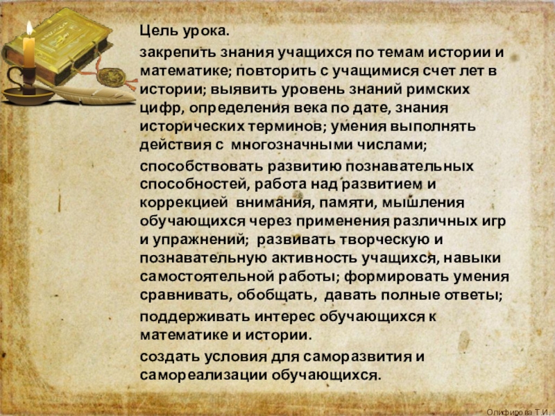 учащимися счет лет в истории; выявить уровень знаний римских цифр, определения века по дате, знания исторических терминов; умения выполнять действия с многозначными числами;