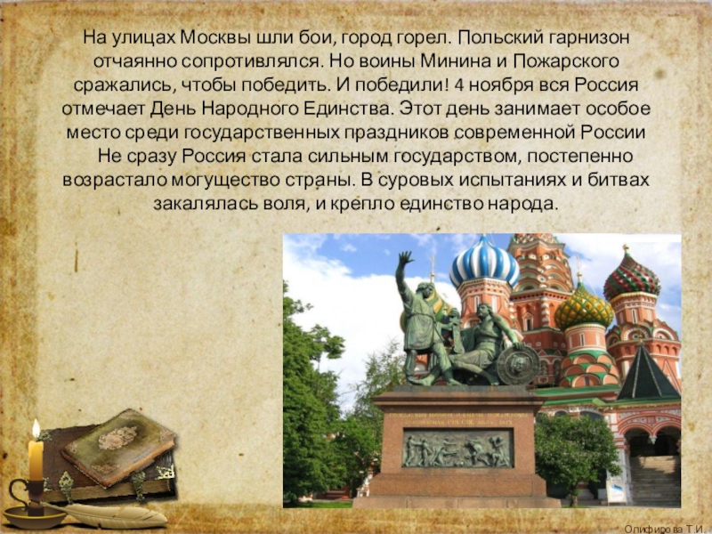 Но воины Минина и Пожарского сражались, чтобы победить. И победили! 4 ноября вся Россия отмечает День Народного Единства. Этот день занимает особое место среди государственных праздников современной России