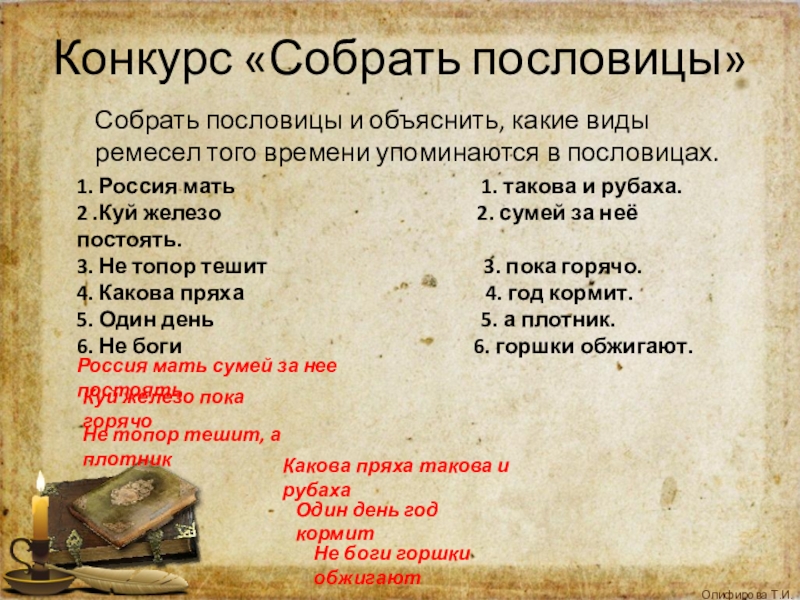 Собрать пословицы и объяснить, какие виды ремесел того времени