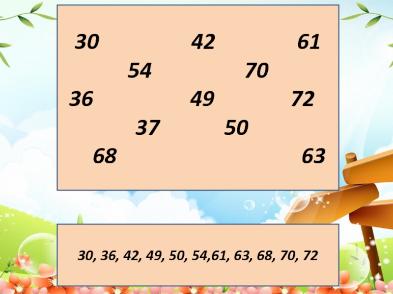 30, 36, 42, 49, 50, 54,61, 63, 68, 70, 72